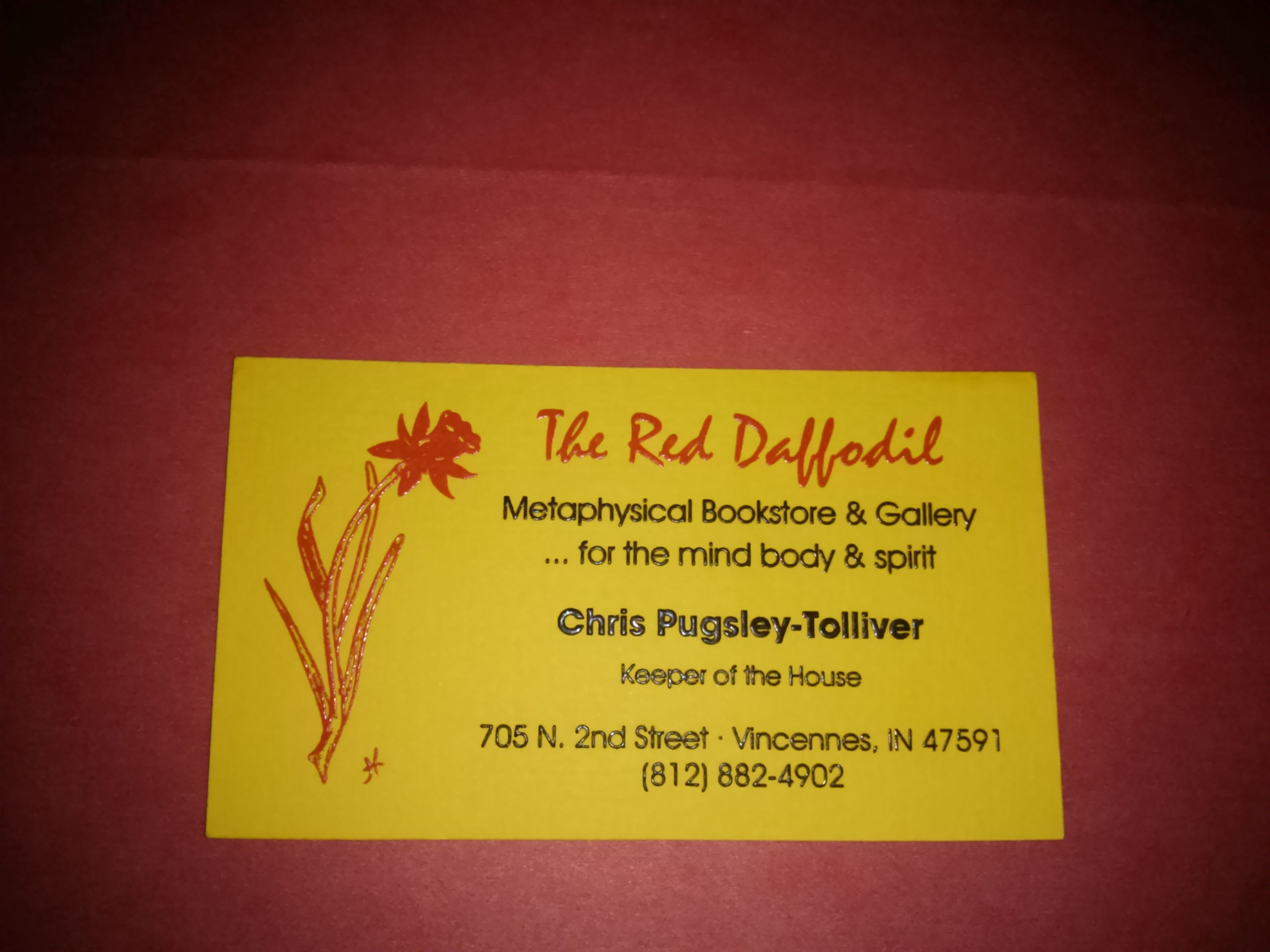 The one thing that still eluded me was what to name it…….more prayers and meditations until one night in a dream Spirit answered me. She explained to me what to call it and why, and that the name would stay with me for a very long time and would all-ways mean much to me. She even told me what colors to use on the sign and business cards and to use inside the store. In short, Spirit guided my every step. My gratitude is endless and to this day The Red Daffodil is who I am and will ever be.